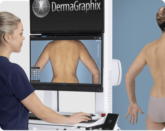 Дерматоскопы цифровые Canfield, вариант исполнения "Интеллистудио Дермаграфикс" (IntelliStudio DermaGraphix)* – это самые современные системы автоматизированной картографии всей поверхности тела и дерматоскопического анализа новообразований. Полная съёмка всей поверхности тела пациента производится не более, чем за 3 минуты. Процесс фотосъёмки управляется программой "Дермаграфикс" (DermaGraphix), которая ведёт пользователя от начала до конца через алгоритм действий в виде графических шаблонов, демонстрируемых на экране монитора. Съёмка настолько проста, что её может выполнять даже ассистент без особой подготовки. После окончания съёмки программа составляет полную карту тела, на которой немедленно помечаются все обнаруженные новообразования, – они выстраиваются на экране монитора в виде графической таблицы. Подозрительные новообразования автоматически (технология безмаркерного отслеживания Canfield) помечаются красным ободком. Разрешение карты тела настолько велико, что от программы не ускользают даже самые маленькие новообразования. Врач может сразу же приступить к изучению помеченных красным новообразований и провести их микрофотосъёмку с помощью Цифрового дерматоскопа "Визиомед Д200" или "Визиомед Д2", входящего в состав "Интеллистудио Дермаграфикс". "Визиомед Д200" и "Визиомед Д2" оснащены встроенным сенсорным дисплеем, который помогает центрировать объектив на новообразовании без необходимости отвлечения на экран компьютера и работы с клавиатурой и мышью.