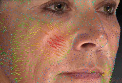 Безмаркерное отслеживание обеспечивает оценку изменений поверхности кожи в динамике. При отслеживании изменений достигается автоматическое совпадение одних и тех же участков кожи, что помогает оценке изменений топографии кожи.